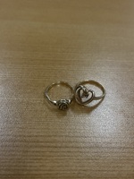 Two gold-colored rings are sitting next to each other. The circle-shaped ring on the left resembles the shape of a rose and in the middle, there is a shiny object at its core. The ring on the right is heart-shaped with a visible shiny object missing. The bands to both rings are slightly out of shape.