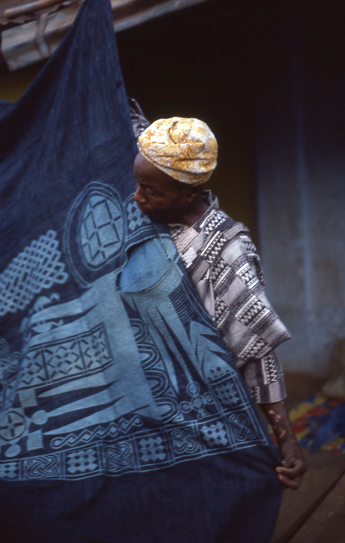 A picture of a woman holding a tapestry