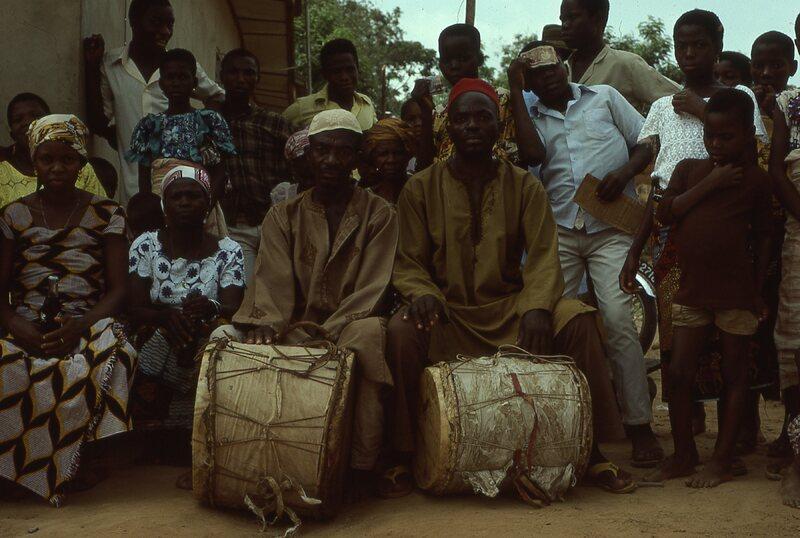 A picture of people surrounding two drummers