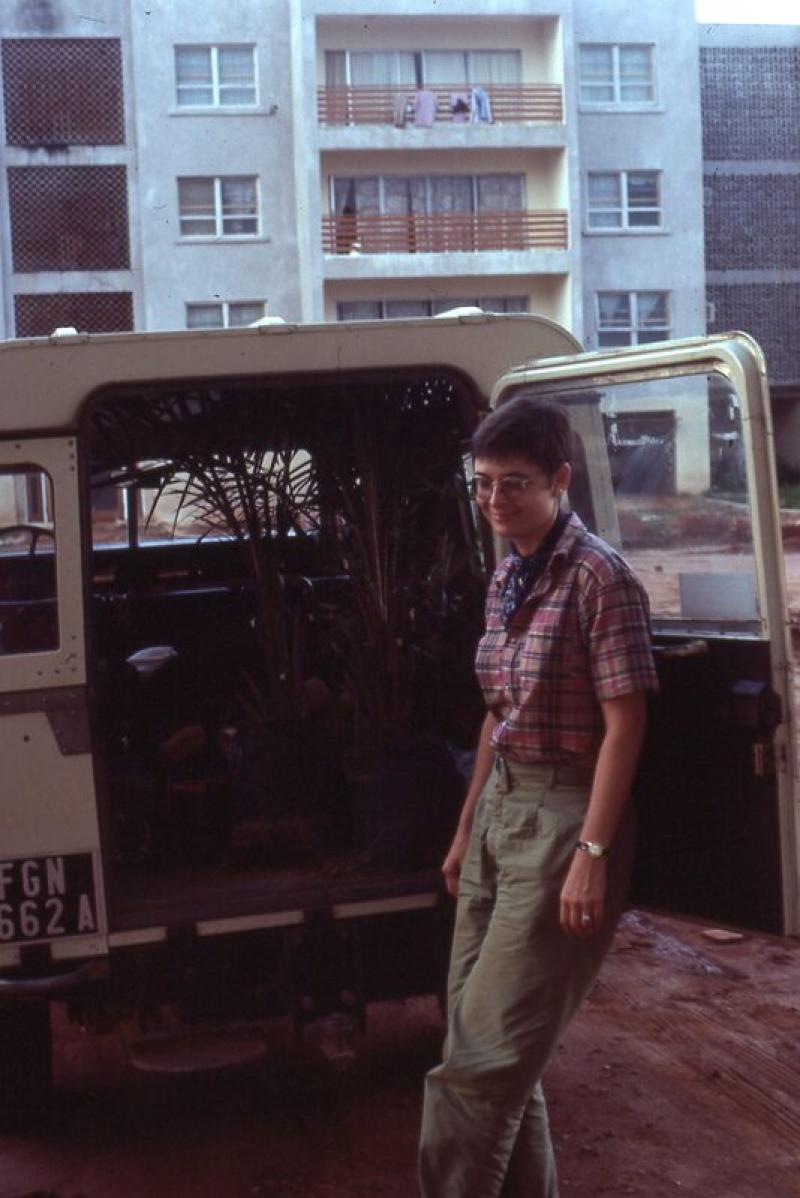 A picture of a woman outside of a van