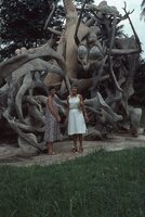 A picture of people standing in front of a carved tree