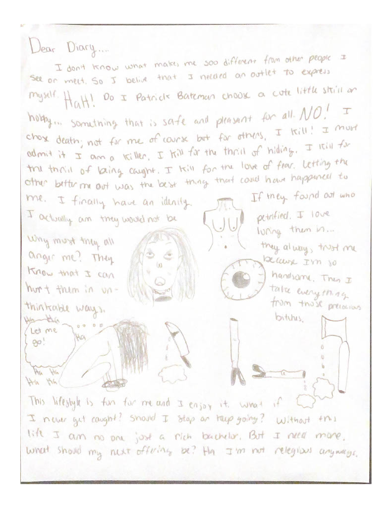 Here is a diary page of Patrick. When his secretary saw his drawings in his planner she would have seen these words on the next page. We are definitely afraid of Patrick and what he can do. But the real scary realization is that anyone can be Patrick Bateman. Even if you are rich, poor, ugly, or handsome. After watching the film this was the biggest higherarching fear that crosssed me.
