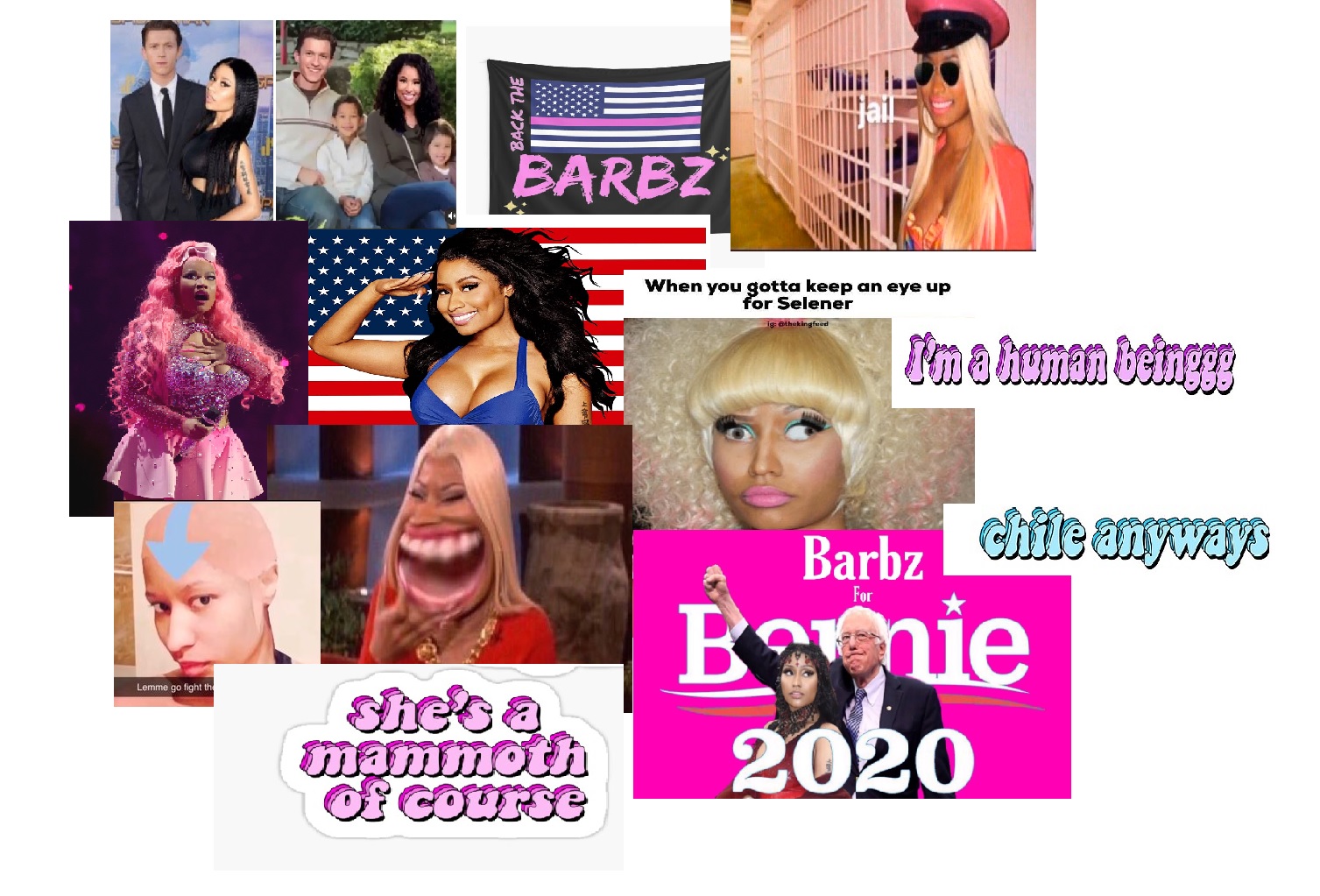 My aim of this collage was to represent a niche kind of comedy that finds its way into almost every internet conversation. I would say that the metaverse of Nicki minaj and her “barbz” is very prominent and extravagant in internet culture. There is a sense of camp that comes with the territory. Since it was created mainly by her queer stans who were attracted to nicki’s rap skills,charm, and alter egos. There are some stans that are hyper serious in what they believe about Nicki minaj being the queen of rap, where most find the meme culture just fun to be around and to identify with. Many can identify with the randomness of and constant inserting of this standom on the internet. As seen in the college there is a pattern of randomness and unseriousness that sparks the stans. A common humor theme we looked at this semester was the constant randomness and contextual moments that encapsulate humor which is a major theme in Nicki Stan culture.